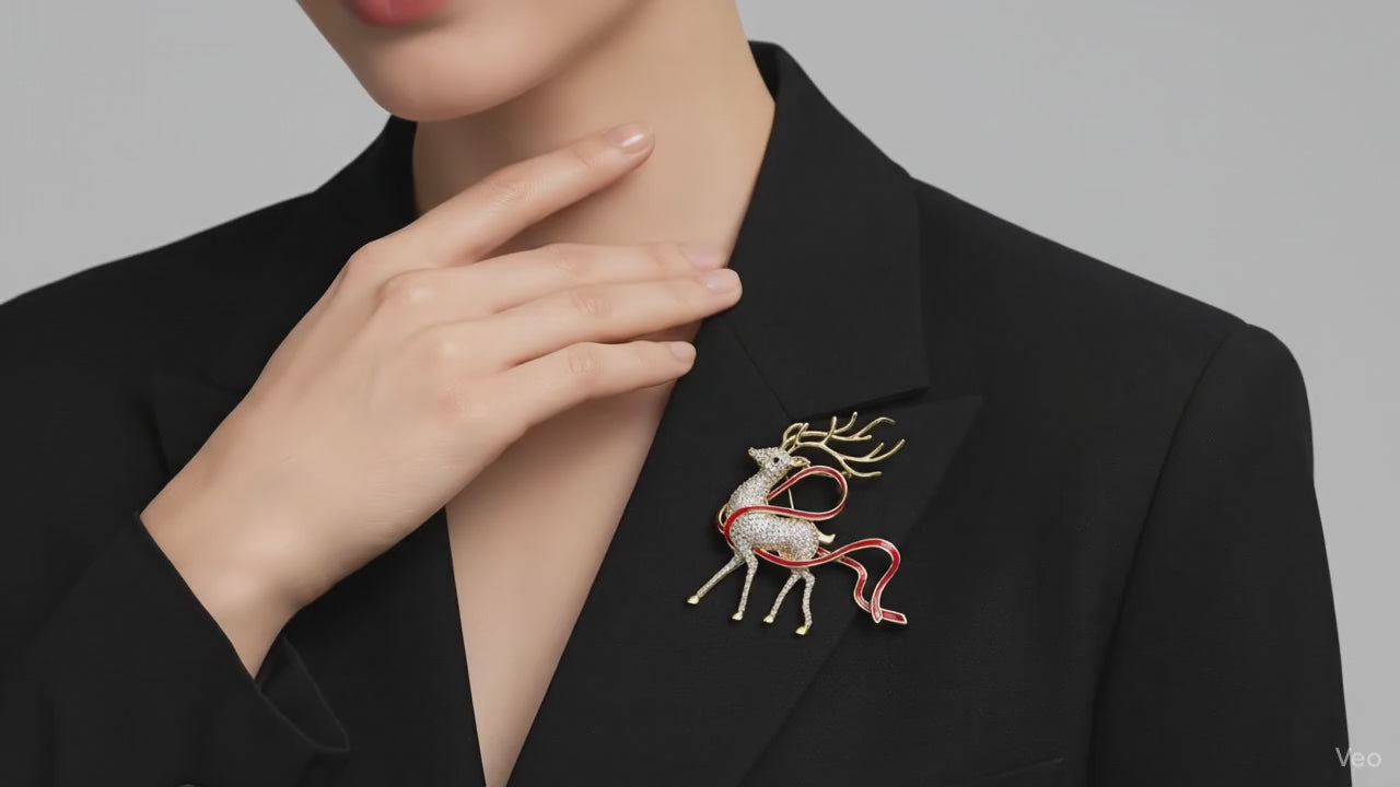 Unisex stag brooch with gold finish and red detailing styled on a black blazer
